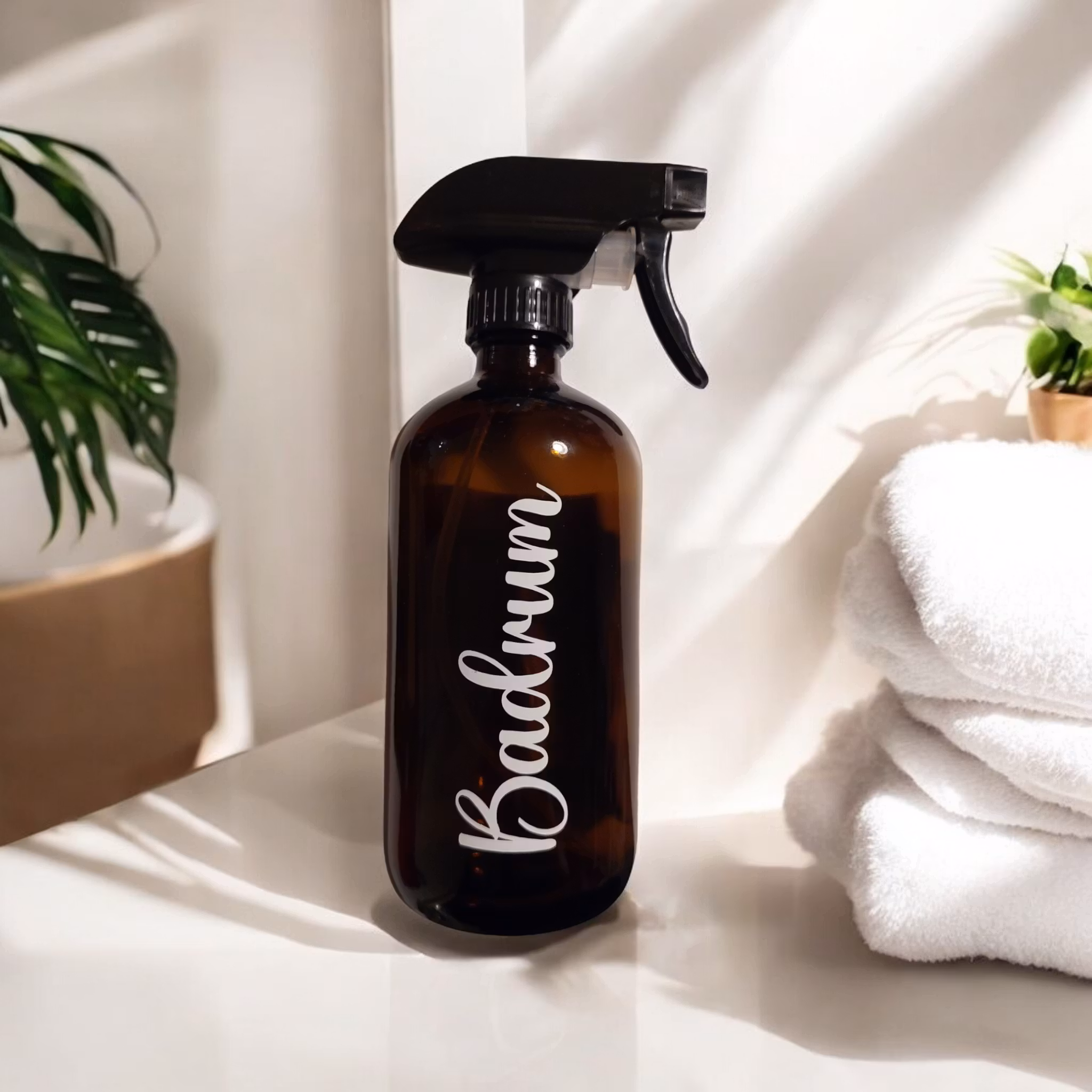 1 st tom sprayflaska i brunt glas. Flaskan har text i vinyl.