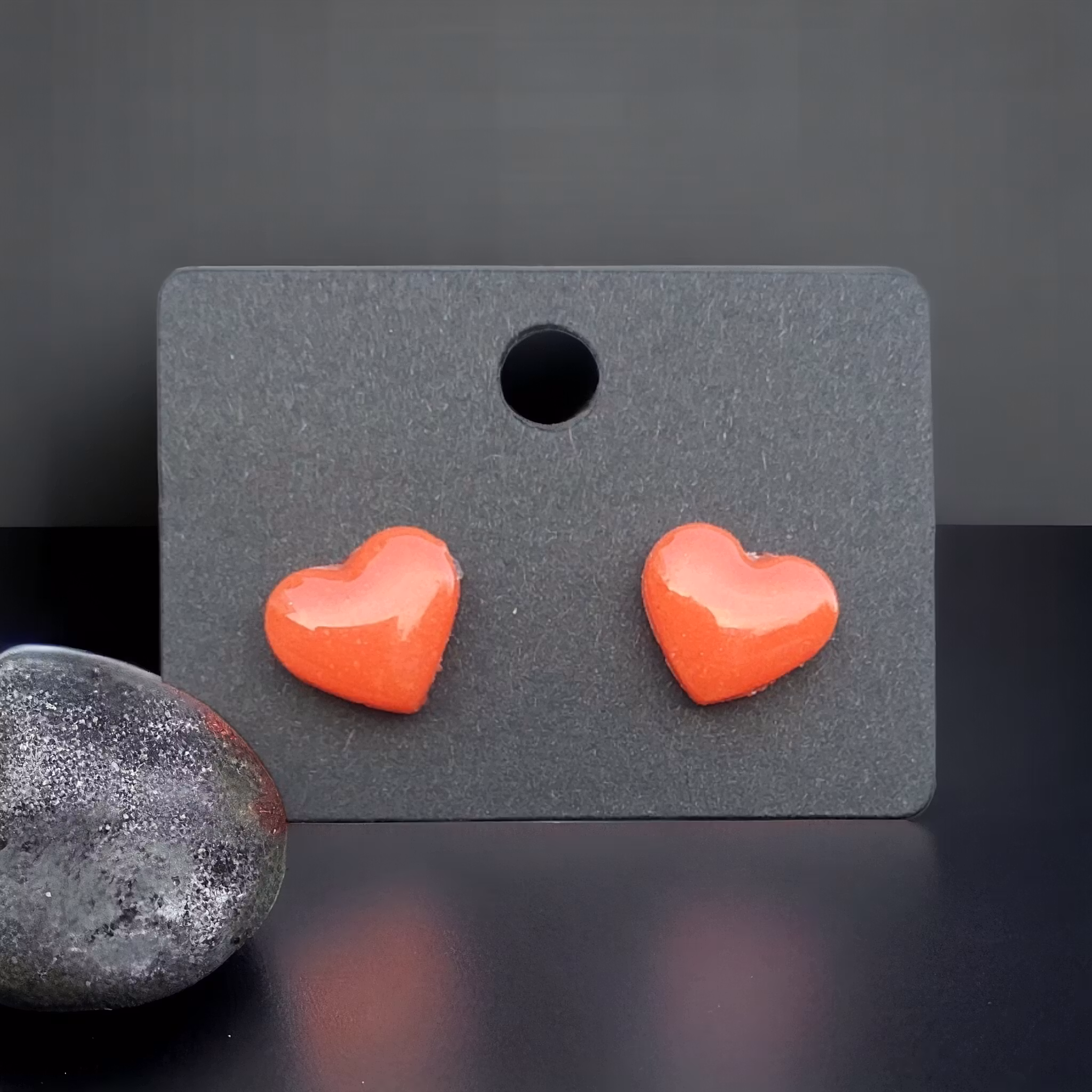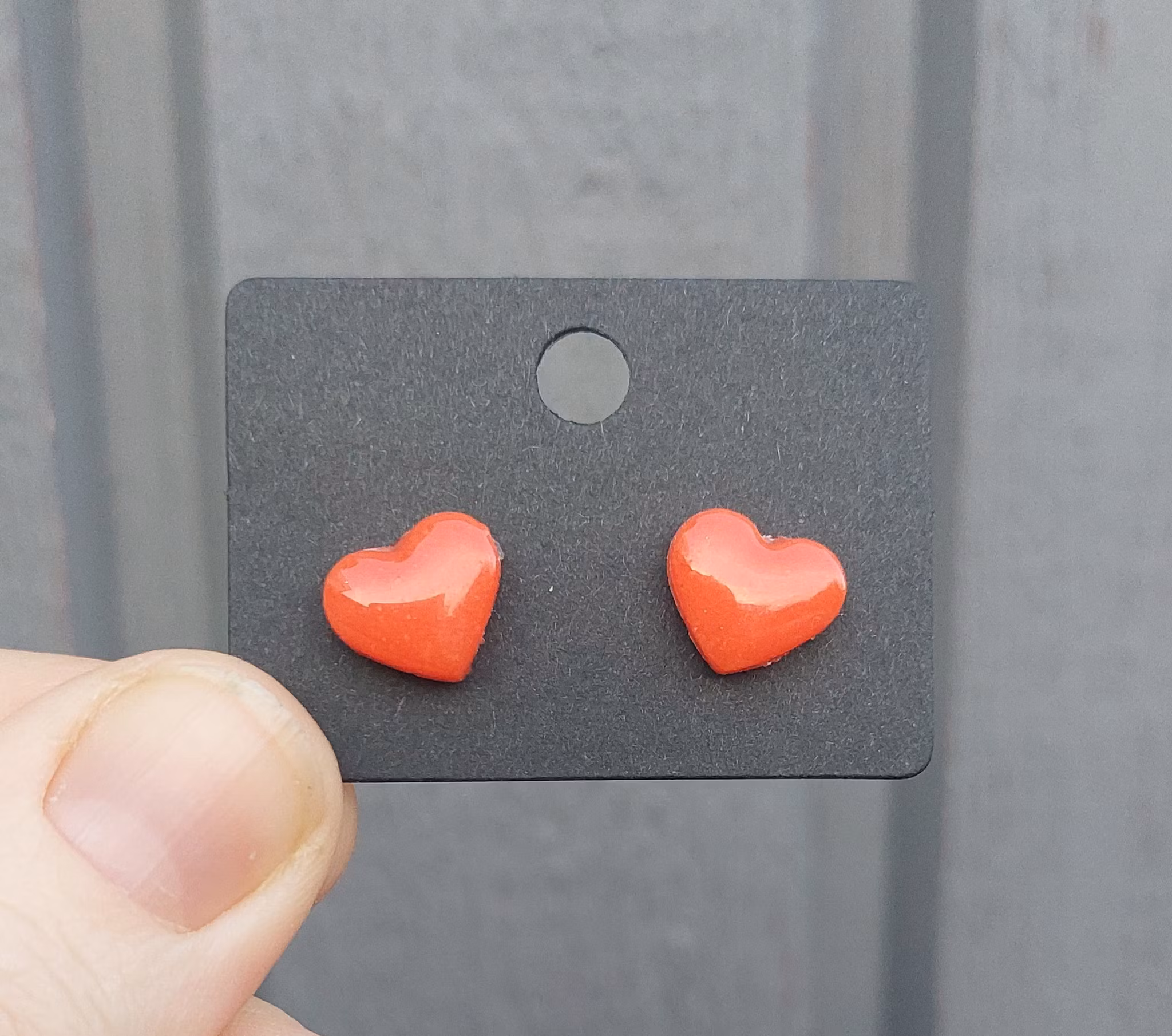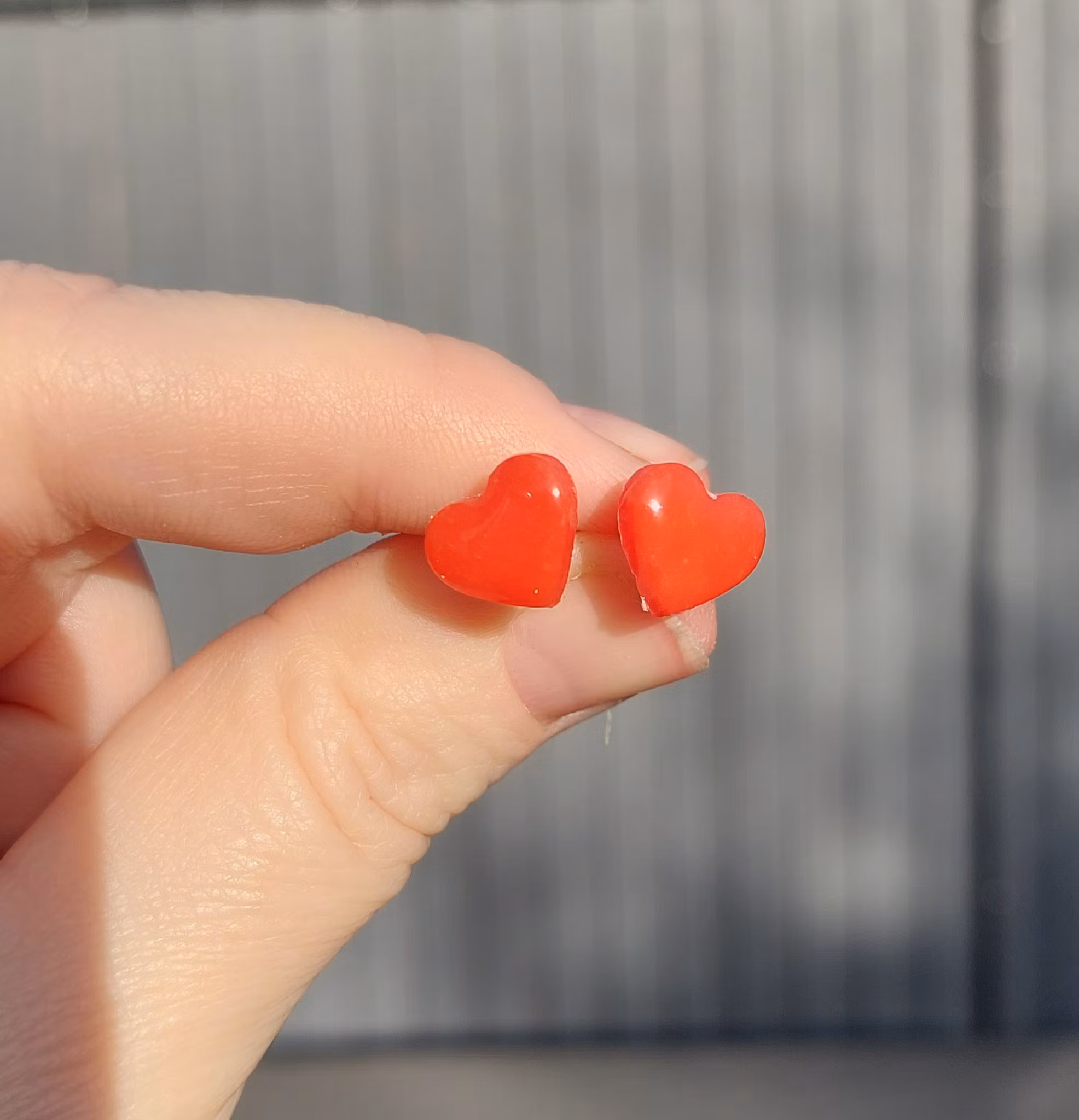 Örhängen gjorda i polymerlera. Föreställer små röda glansiga hjärtan.