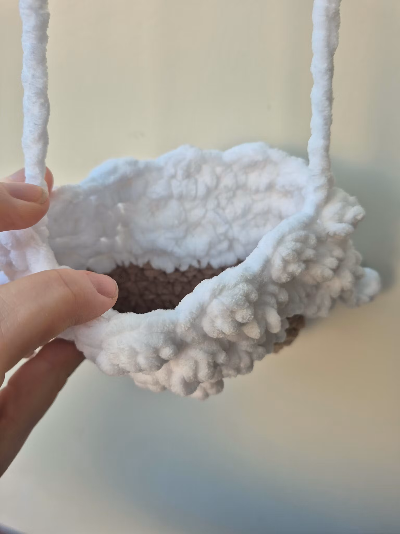 En jättegullig liten handväska för barn. Väskan är virkad i ett supermjukt garn ( Chenillegarn)