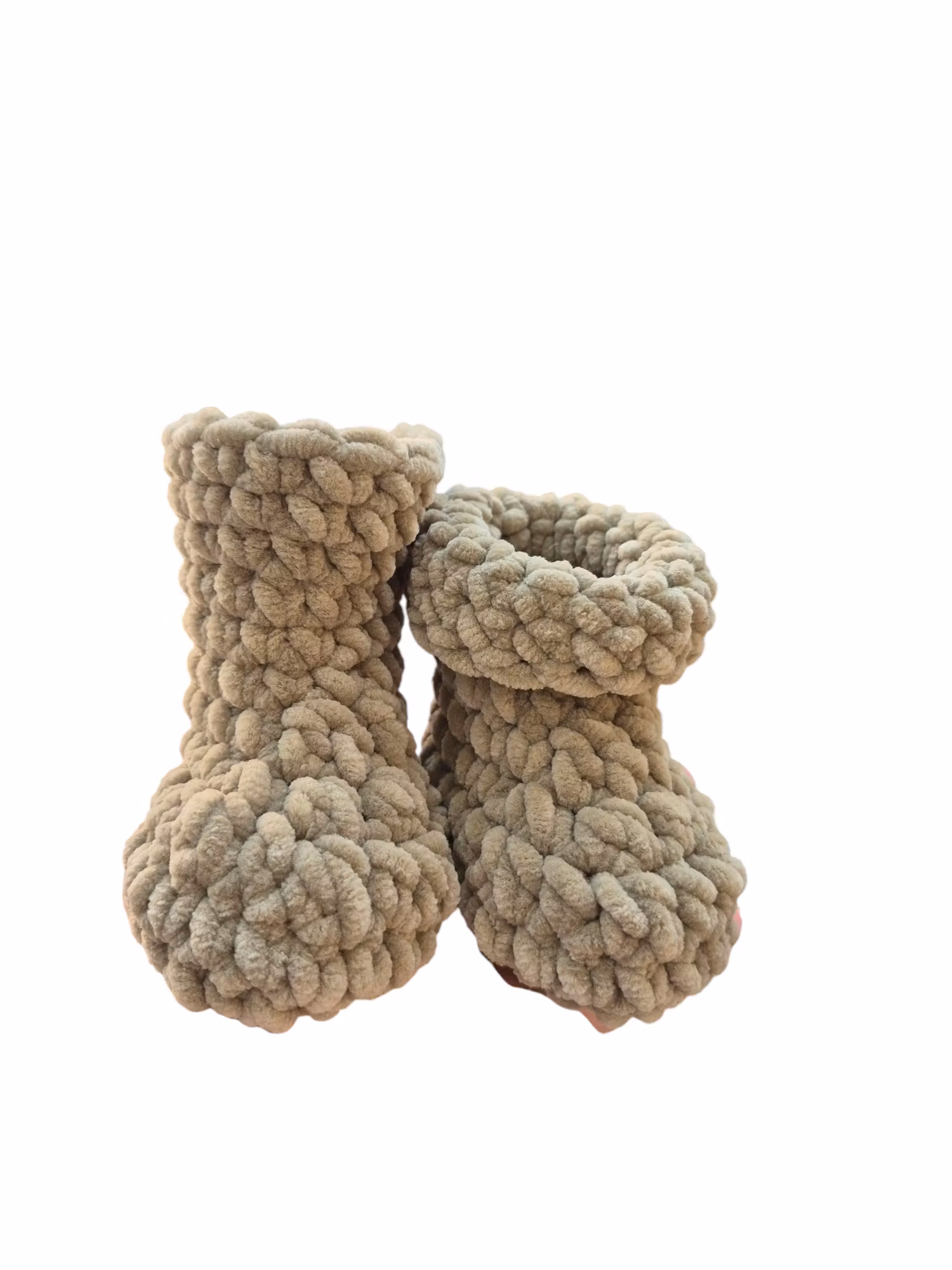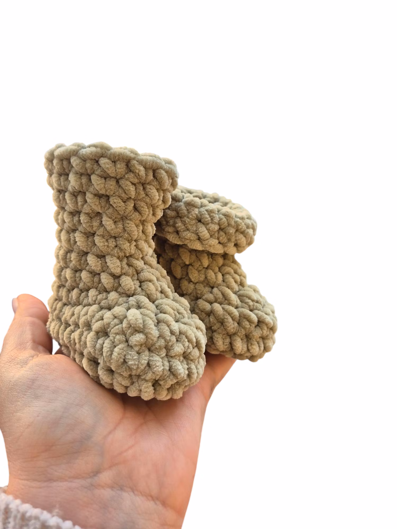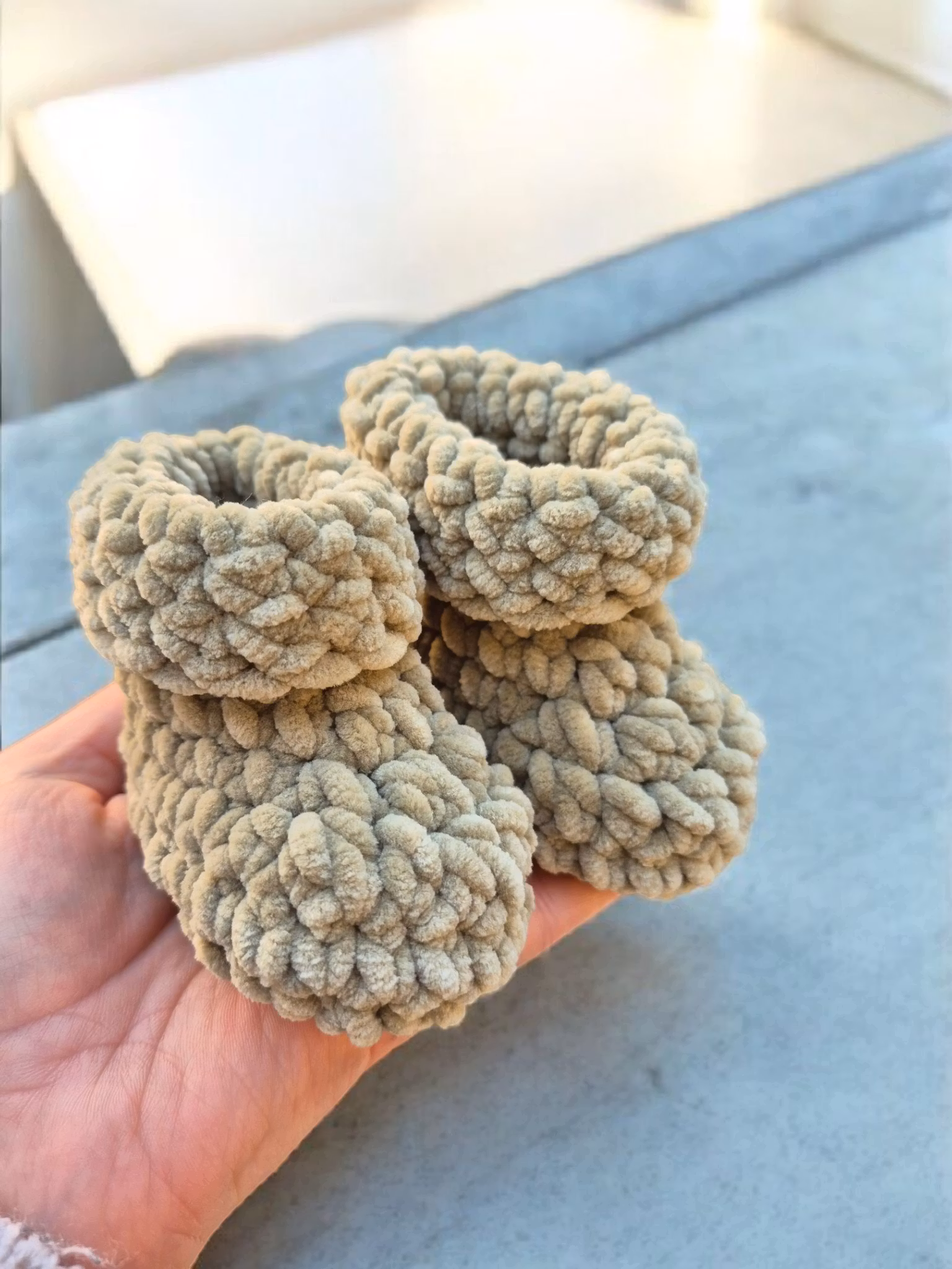 Underbart söta små babykängor virkat i ett beigegrönt supermjukt garn. Garnet är ett chenillegarn.